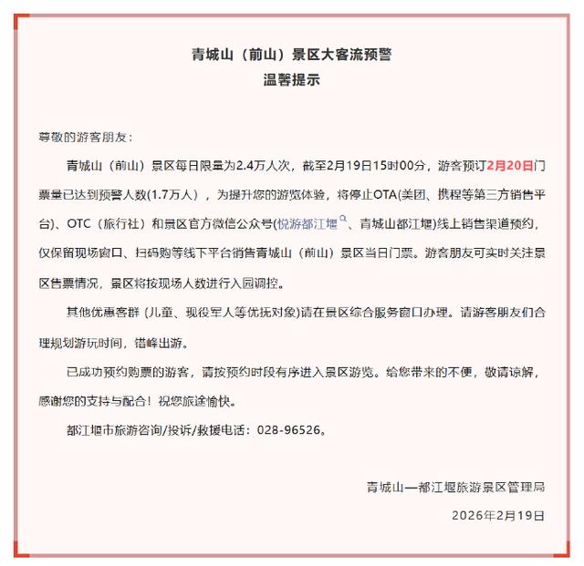 限制2月19日15时,青城山(前山)景区2月20日门票预订量已达到预警东谈主数1.7万东谈主。景区已住手OTA(好意思团、携程等)、OTC(旅行社)及官方微信公众号“悦游皆江堰”“青城山皆江堰”线上销售渠谈预约,仅保留现场窗口、扫码购等线下平台销售当日门票。景区将凭证现场东谈主数进行入园调控,请旅客实时热心。
