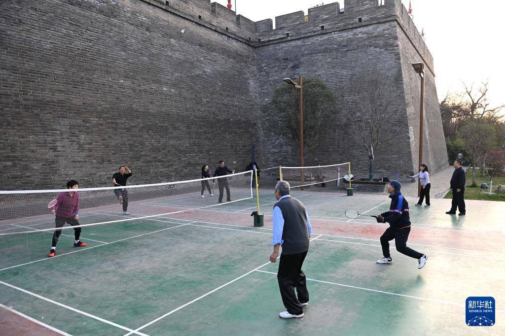 3月20日,市民在西安城墙环城公园文昌门至和平门段打羽毛球。