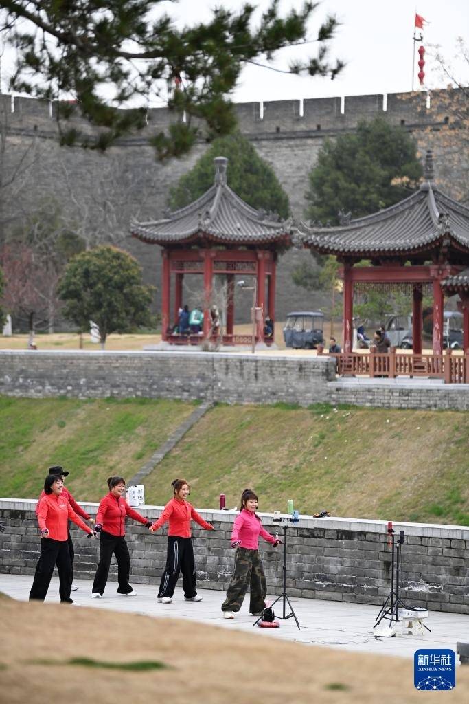 3月19日,市民在西安城墙环城公园玉祥门至平缓门段跳健身操。