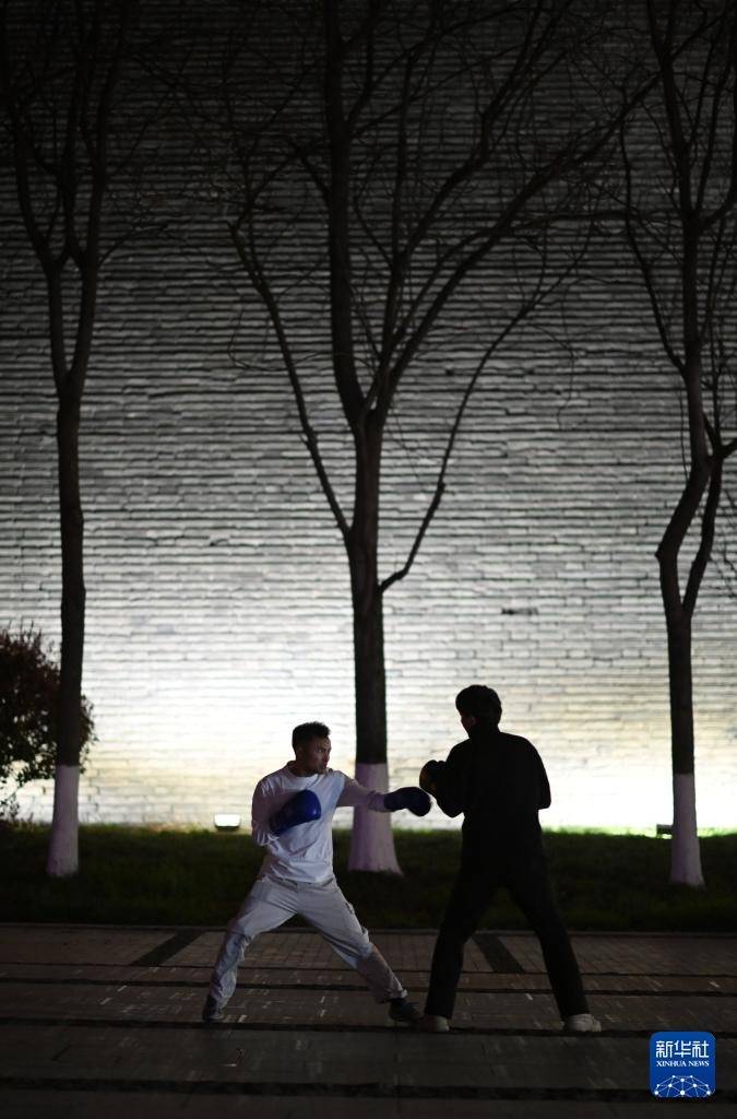 3月19日,市民在西安城墙下的环城公园玉祥门至西北城角段教育拳击。