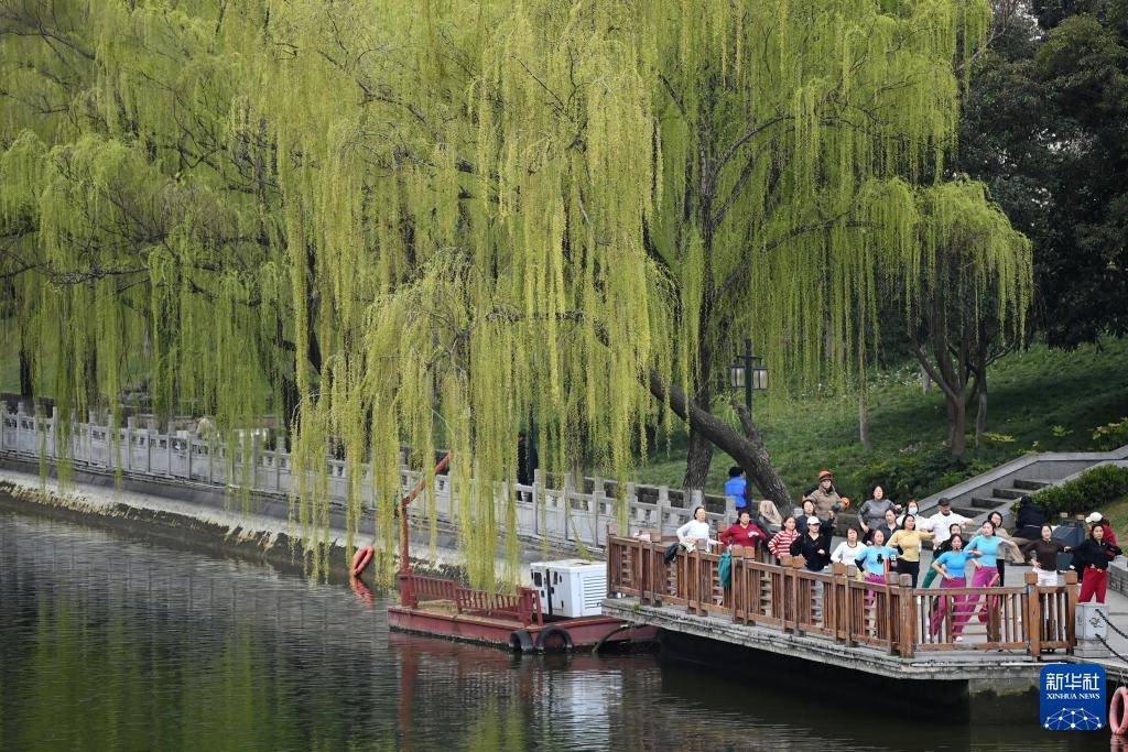 3月19日,市民在西安城墙环城公园玉祥门至平缓门段的护城河边跳健身操。