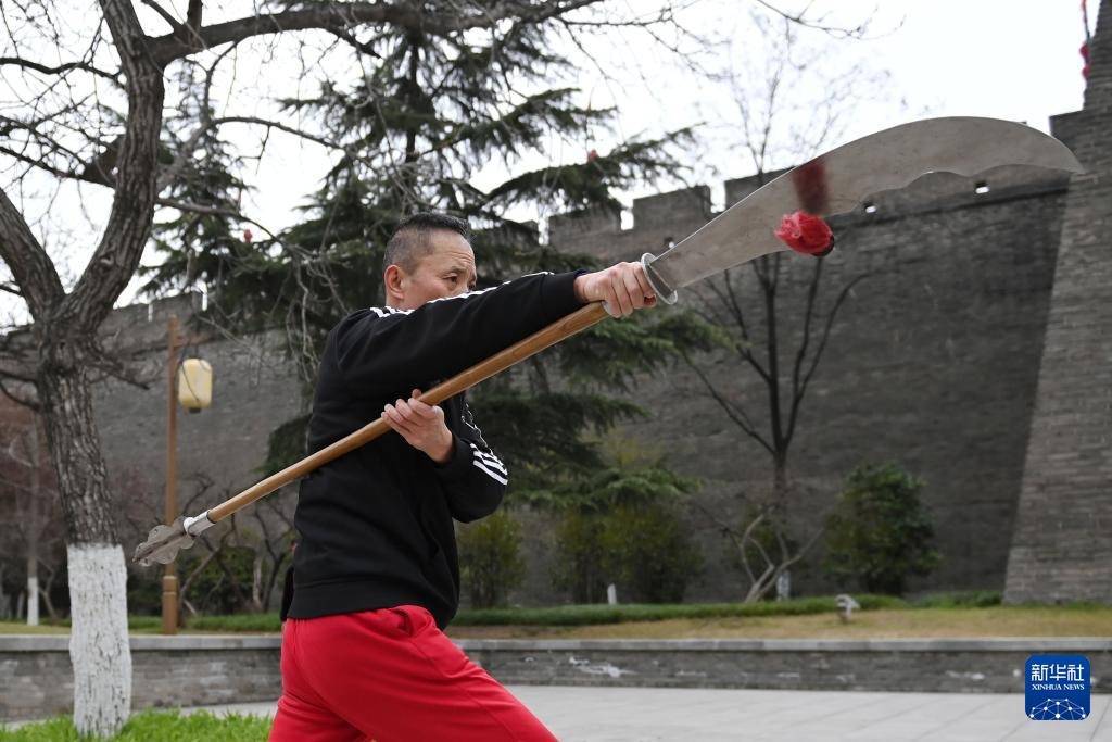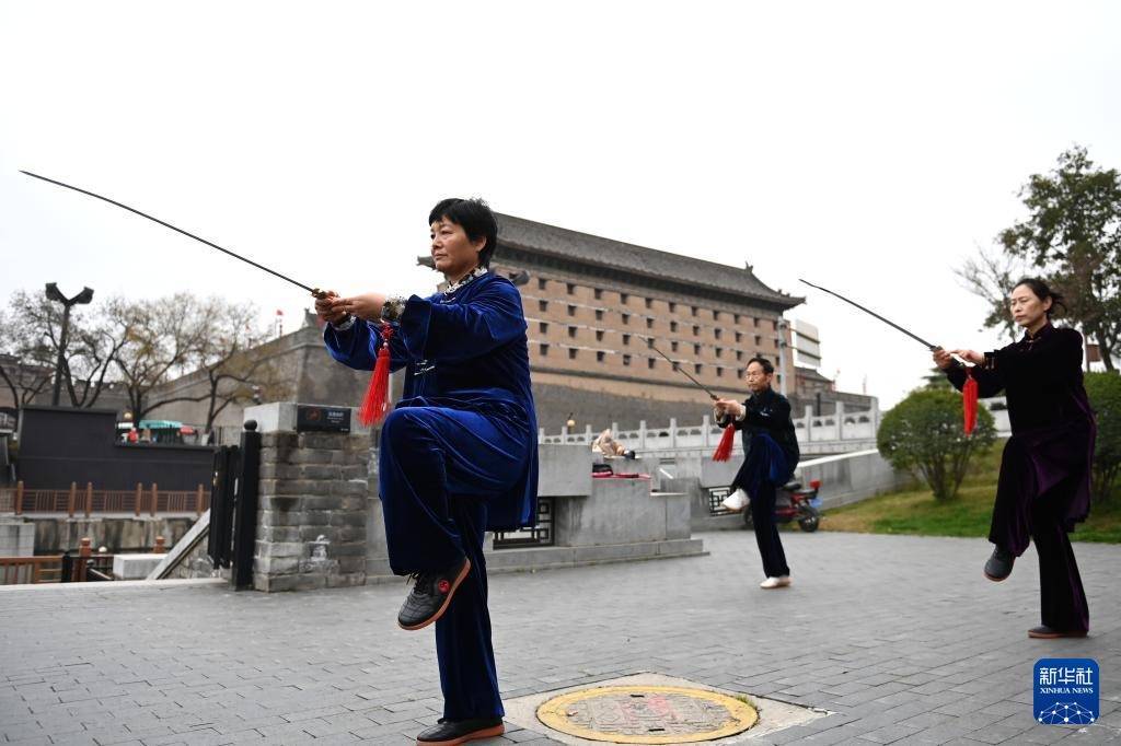 3月19日,市民在西安城墙环城公园平缓门外教育太极剑。