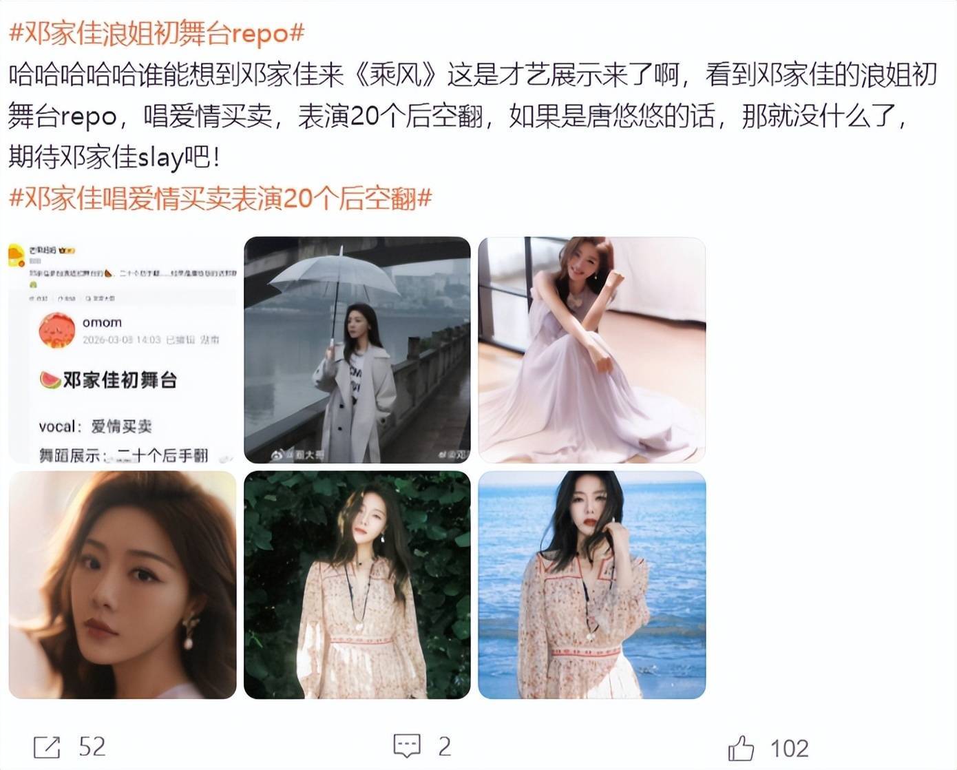 据知情东谈主士清楚,在《乘风 2026》的初舞台上,邓家佳的才艺扮演超过稀奇,竟要平直扮演 20 个后空翻。此音信一出,网友们纷纷辩驳:如果是唐悠悠来,那就很宽泛了。